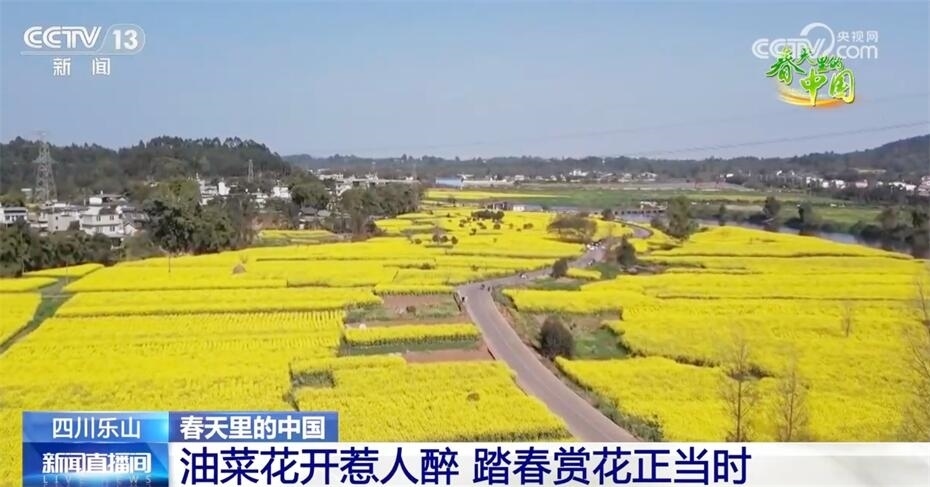 遠眺峨眉山,近看峨眉河,萬頃金波花如海,流金溢彩百里香?,F(xiàn)在我們看到的是四川樂山市中區(qū) 永和村的近千畝油菜花,在陽光照射下,猶如斑斕的綢帶,妝點了峨眉河沿岸五彩的山色春光。趁著晴好天氣,市民、游客來到戶外踏青賞景,在花田中徜徉流連,感受春日美好時光。