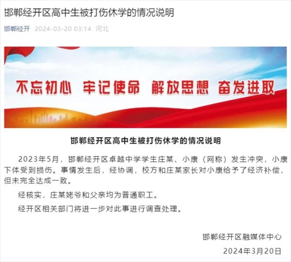·河北邯鄲一學(xué)生被同學(xué)打傷睪丸休學(xué),打人者自稱姥爺是縣長,當?shù)赝▓蟆?/p>