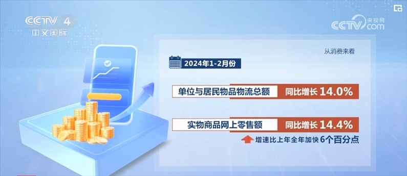 從消費(fèi)來看,1—2月份,單位與居民物品物流總額同比增長14.0%,實(shí)物商品網(wǎng)上零售額同比增長14.4%,增速比上年全年加快6個(gè)百分點(diǎn);快遞業(yè)務(wù)量超過230億件,同比增長28.5%,比上年全年加快9.1個(gè)百分點(diǎn)。