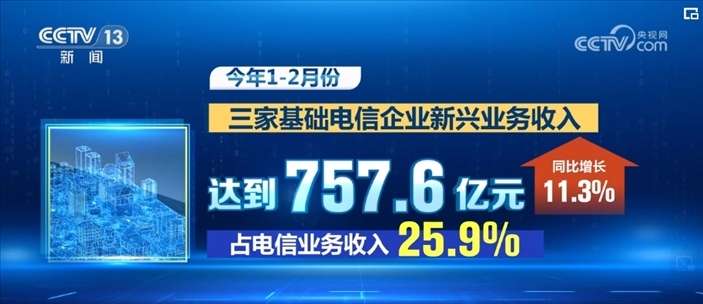 數(shù)據(jù)顯示,2024年1—2月份,三家基礎電信企業(yè)新興業(yè)務收入達到757.6億元,同比增長11.3%,占電信業(yè)務收入的25.9%,其中,云計算和大數(shù)據(jù)收入分別同比增長17.3%和30.3%。截至2月末,三家基礎電信企業(yè)發(fā)展蜂窩物聯(lián)網終端用戶23.64億戶,占移動網終端連接數(shù)比重達57.5%。