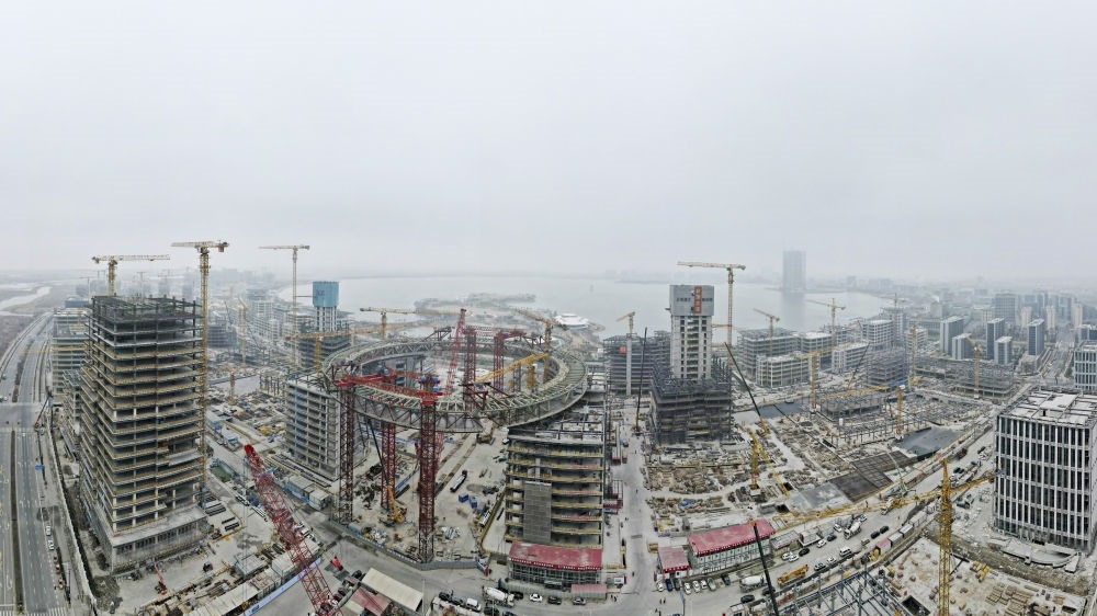 空中俯瞰建設(shè)中的上海臨港新片區(qū)滴水湖金融灣項(xiàng)目(2024年1月18日攝,無人機(jī)全景照片)。新華社記者 方喆 攝