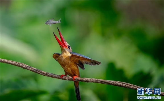 鸛嘴翡翠進食瞬間(3月30日攝)。新華網發(fā)(朱邊勇 攝)