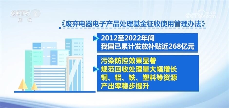 我國設立“廢棄電器電子產品處理基金”,用于補貼回收處理廢棄電器電子產品。根據(jù)《廢棄電器電子產品處理基金征收使用管理辦法》,2012至2022年間,我國已累計發(fā)放補貼近268億元,污染防控效果顯著,規(guī)范回收處理量大幅增長,銅、鋁、鐵、塑料等資源產出率穩(wěn)步提升。
