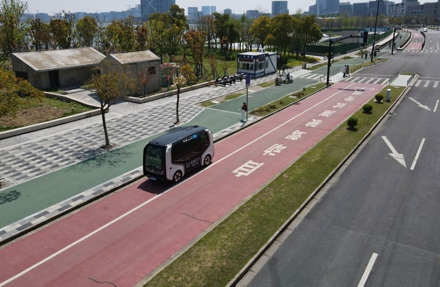 在中國(guó)(上海)自由貿(mào)易試驗(yàn)區(qū)臨港新片區(qū),一輛無人駕駛汽車行駛在自動(dòng)駕駛測(cè)試專用路上(無人機(jī)照片,2024年4月9日攝)。