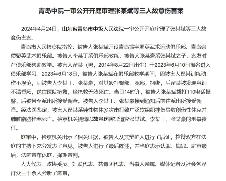 ·青島8歲男童武術(shù)俱樂(lè)部被毆打致死案4月24日開(kāi)庭,將擇期判。