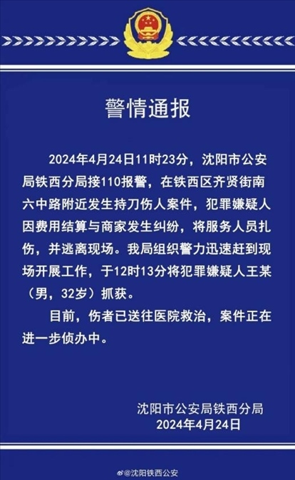 ·沈陽(yáng)鐵西區(qū)發(fā)生一起持刀傷人案,犯罪嫌疑人已被抓獲。
