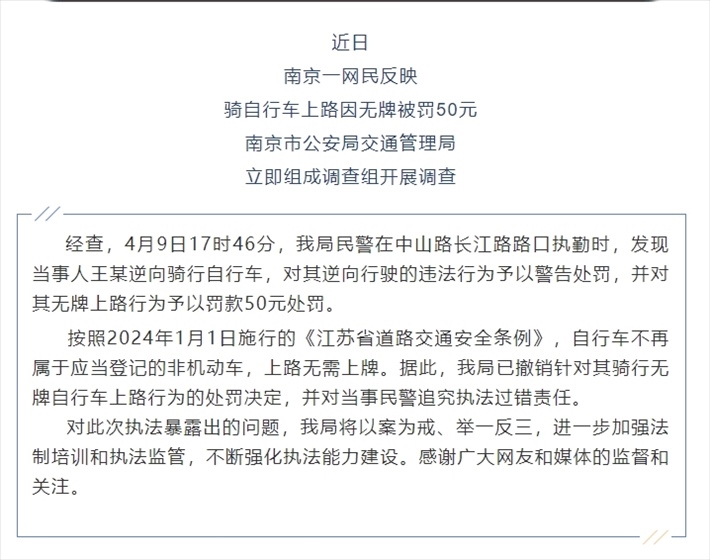 ·南京交警回應(yīng)市民騎自行車(chē)無(wú)牌被罰50元:撤銷處罰,追究民警責(zé)任。
