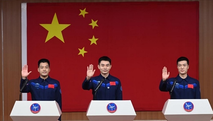 神舟十八號(hào)瞄準(zhǔn)4月25日20時(shí)59分發(fā)射,航天員葉光富(中)、李聰(右)、李廣蘇在酒泉衛(wèi)星發(fā)射中心問(wèn)天閣與媒體記者集體見(jiàn)面。