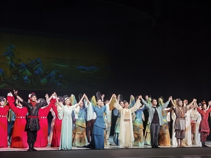 ?2024年4月17日《只此青綠》第500場(chǎng)演出在上海文化廣場(chǎng)上演。圖為主要演員謝幕。新華社記者許曉青 攝