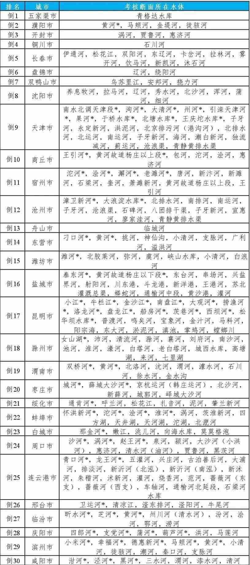 咸陽市泔河入涇河、朝陽市大凌河西支入河口和綏化市/黑河市通肯河大橋等30個國家地表水考核斷面水環(huán)境質(zhì)量變化情況相對較好(從第1名至第30名),渭南市裕西、天津市新老米店閘和玉溪市化念水庫等30個國家地表水考核斷面水環(huán)境質(zhì)量變化情況相對較差(從倒數(shù)第1名至倒數(shù)第30名)。