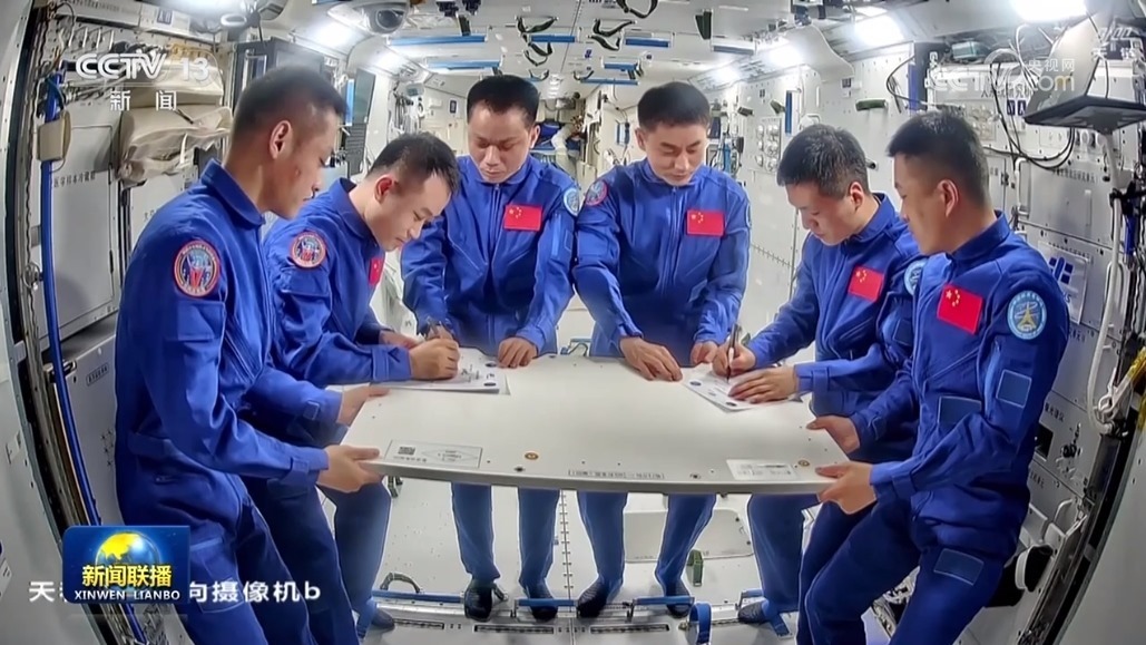 下午三時(shí)許,神舟十七號(hào)航天員湯洪波、唐勝杰、江新林和神舟十八號(hào)航天員葉光富、李聰、李廣蘇在空間站天和核心艙在軌舉行交接儀式,6名航天員分別在確認(rèn)書上簽字。