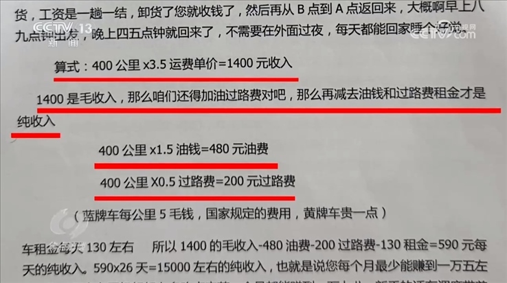 這些公司在和司機簽約時,根據(jù)司機個人情況的不同,對他們收取幾千元到幾萬元不等的費用。還沒掙錢就先交錢,而且交的還不少,司機們?yōu)槭裁磿母是樵傅亟贿@些錢呢?因為面試時,公司給司機們詳細(xì)算過他們的收入。