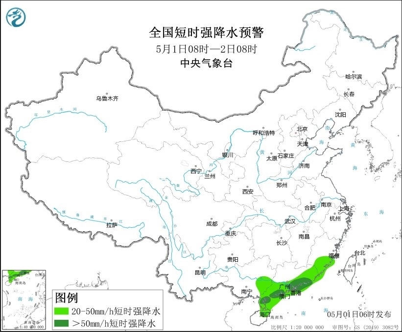 央視網(wǎng)消息:中央氣象臺5月1日06時發(fā)布強對流天氣藍色預警:預計5月1日08時至2日08時,廣東南部及沿岸海域等地的部分地區(qū)將有8-10級雷暴大風或冰雹天氣,最大風力11級以上;福建東南部、廣西東部、廣東中南部、海南島東北部及華南沿岸海域等地的部分地區(qū)將有小時雨量大于20毫米的短時強降水天氣,其中廣東南部及沿岸海域等地局地最大小時雨量大于50毫米,最大可達70毫米以上。