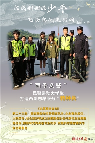 浙江省杭州市公安局西湖風(fēng)景名勝區(qū)分局組織公安巡特警、消防、交警、行政執(zhí)法、平安志愿者等各方力量參與社會(huì)治理工作,逐漸壯大的“西子義警”隊(duì)伍已成為西湖邊守望平安的重要力量。近期,一群朝氣蓬勃的青年大學(xué)生加入“西子義警”隊(duì)伍,共同營(yíng)造更加和諧的西湖景區(qū)平安環(huán)境。