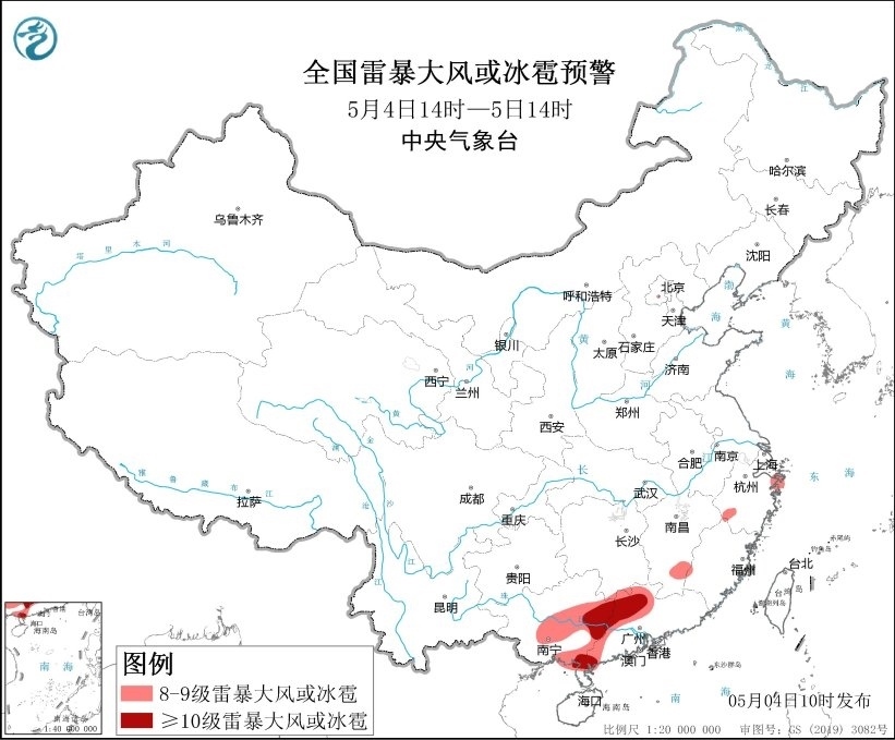 央視網(wǎng)消息:中央氣象臺5月4日10時(shí)繼續(xù)發(fā)布強(qiáng)對流天氣藍(lán)色預(yù)警,預(yù)計(jì)5月4日14時(shí)至5日14時(shí),廣西中東部、廣東西部、江西南部等地的部分地區(qū)將有8-10級雷暴大風(fēng)或冰雹天氣,其中廣西東部和東南部沿海、廣東西北部和西南部沿海等地的局地將有10級以上雷暴大風(fēng),最大風(fēng)力可達(dá)11級;湖南南部、江西、福建西部和東南部、貴州西南部、廣西中東部、廣東、海南島北部等地的部分地區(qū)將有小時(shí)雨量大于20毫米的短時(shí)強(qiáng)降水天氣,其中廣西東部、廣東中西部等地的局地最大小時(shí)雨量大于50毫米,最大可達(dá)80毫米以上。