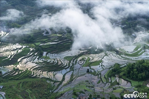 2024年5月5日,重慶酉陽(yáng)花田鄉(xiāng)何家?guī)r村萬(wàn)畝灌水梯田等待插秧,鄉(xiāng)村云霧繚繞風(fēng)景如畫。