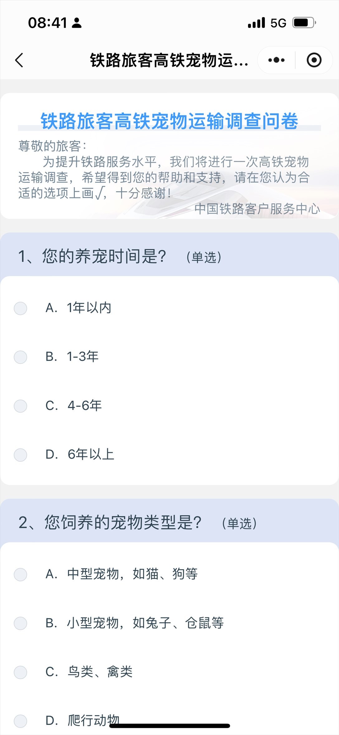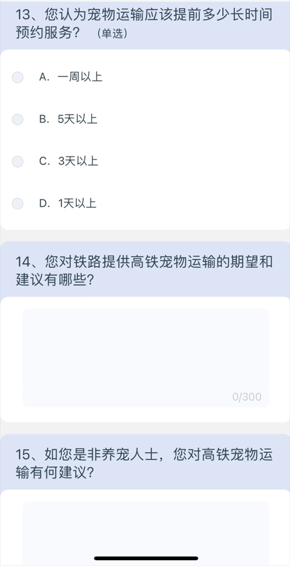 5月10日上午8點40分,澎湃新聞記者通過掃描網(wǎng)友分享的列車上的二維碼,進入12306系統(tǒng),選擇問卷·建議,進入“鐵路旅客高鐵寵物運輸”調(diào)查,共15個問題,涉及養(yǎng)寵類型、是否有攜帶寵物出行的需求、如果鐵路提供寵物運輸服務是否愿意嘗試等,以及為降低對其他旅客的影響,在高鐵寵物運輸更關注哪方面的防護;如鐵路提供高鐵寵物運輸服務,期望的定價標準;如鐵路提供高鐵寵物運輸服務,最關注的內(nèi)容;如果是非養(yǎng)寵人士,對高鐵寵物運輸有何建議等多方面問題。