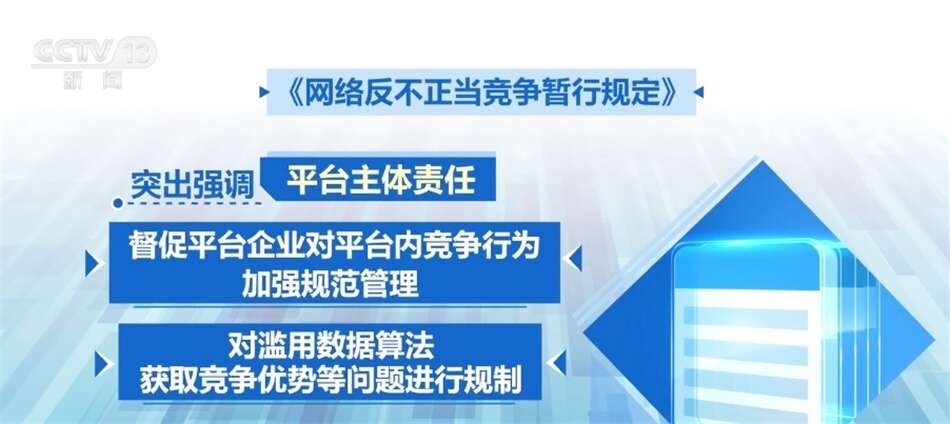 平臺(tái)企業(yè)掌握海量數(shù)據(jù),連接大量主體,既是網(wǎng)絡(luò)不正當(dāng)競(jìng)爭(zhēng)監(jiān)管的重點(diǎn)對(duì)象,也是協(xié)同監(jiān)管的關(guān)鍵節(jié)點(diǎn)?!兑?guī)定》突出強(qiáng)調(diào)了平臺(tái)主體責(zé)任,督促平臺(tái)企業(yè)對(duì)平臺(tái)內(nèi)競(jìng)爭(zhēng)行為加強(qiáng)規(guī)范管理,同時(shí)對(duì)濫用數(shù)據(jù)算法獲取競(jìng)爭(zhēng)優(yōu)勢(shì)等問題進(jìn)行規(guī)制。