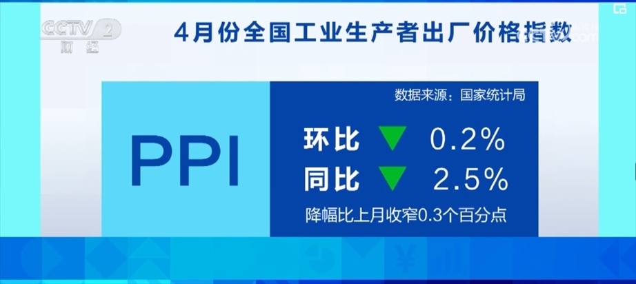 4月份,工業(yè)生產(chǎn)繼續(xù)恢復(fù),全國工業(yè)生產(chǎn)者出廠價(jià)格指數(shù)PPI環(huán)比下降0.2%,同比下降2.5%,降幅比上月收窄0.3個(gè)百分點(diǎn)。