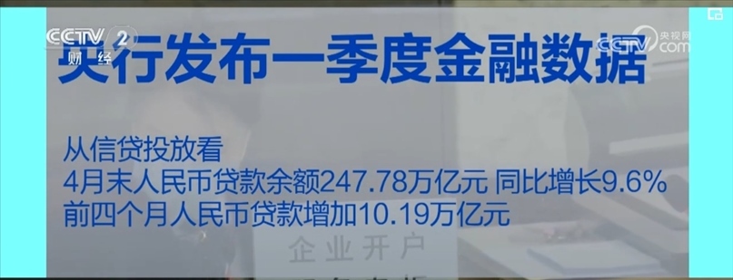 從信貸投放看,4月末,人民幣貸款余額247.78萬億元,同比增長9.6%。前4個(gè)月,人民幣貸款增加10.19萬億元。