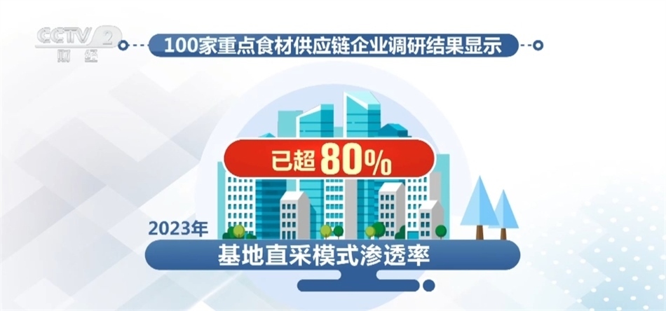 我國(guó)食材供應(yīng)鏈企業(yè)鏈條逐漸向上游延伸。100家重點(diǎn)食材供應(yīng)鏈企業(yè)調(diào)研結(jié)果顯示,2023年基地直采模式滲透率已超80%,有效縮短供應(yīng)鏈鏈條,降低食材采購(gòu)和流通成本。