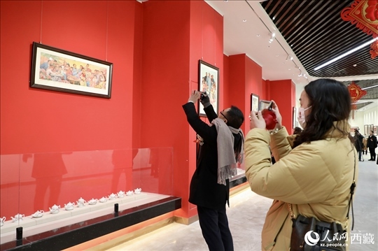 觀眾欣賞由西藏自治區(qū)延安精神研究會(huì)主辦的“紅色記憶”中國(guó)年畫(huà)展。人民網(wǎng)記者 次仁羅布攝