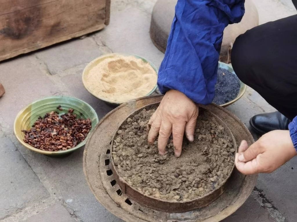 沖好針孔,便在磨石上反復(fù)銼尖。隨后倒入熱鍋里翻炒,再舀入一瓢水,針的剛性和硬度由此增加。接下來(lái)便輪到三大碗“大陽(yáng)秘方”登場(chǎng):白崖土粉末、松木炭和發(fā)酵后的豆豉,用于蒸針。“松木炭可以增加鋼針的含碳量,提升硬度;豆豉增加亮度;白崖土粉末作為分散劑讓針受熱均勻。這樣處理后可以保證針質(zhì)更堅(jiān)硬又有光澤?!?/p>