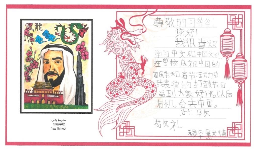 想邀請習(xí)爺爺來阿聯(lián)酋、想和習(xí)爺爺踢一場足球賽、希望能在阿聯(lián)酋動物園里看到大熊貓……在這些精心制作的信箋里,孩子們用中文一筆一劃認(rèn)真書寫自己的心里話,童心與真情躍然紙上。長城、中國龍、大熊貓、祥云、燈籠,孩子們還用五彩斑斕的畫筆表達自己對中國的向往和喜愛,可謂圖文并茂,賞心悅目。