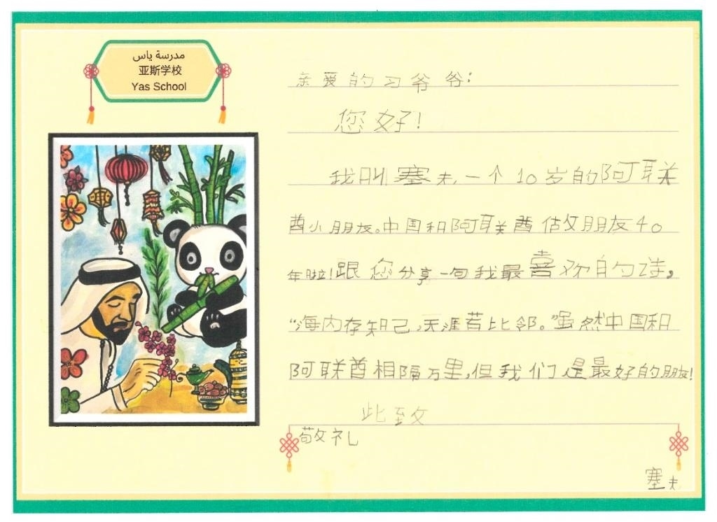 10歲的塞夫就讀于阿聯(lián)酋規(guī)模最大的公立學(xué)校亞斯學(xué)校。他在信中與習(xí)爺爺分享自己最喜歡的一句中國古詩——“海內(nèi)存知己,天涯若比鄰”,因為“雖然中國和阿聯(lián)酋相隔萬里,但我們是最好的朋友!”