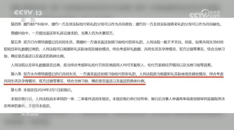 陜西省韓城市人民法院芝陽人民法庭庭長王春妮:“我們跟原告充分釋法明理,讓他知道咱們國家有新的規(guī)定,對他經(jīng)過反復(fù)做工作,他也降低了自己的心理預(yù)期。被告這邊認(rèn)為我跟你在一起共同生活了,我也是實心想跟你過日子,但是因為沒有領(lǐng)證,而且我還跟你共同生育了一個孩子,你現(xiàn)在要求我給你返還彩禮,我就不愿意返還,心里有抵抗情緒?!?/p>