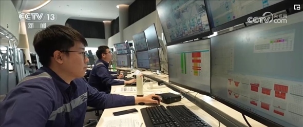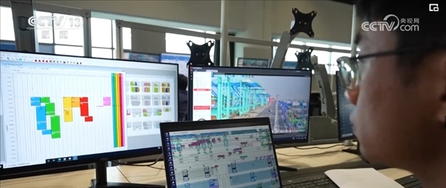 作為系統(tǒng)優(yōu)化師,范春奇全神貫注地盯著3個(gè)屏幕。左邊屏幕是碼頭調(diào)度指令,右邊是現(xiàn)場(chǎng)監(jiān)控的實(shí)時(shí)畫(huà)面,中間是智能水平運(yùn)輸系統(tǒng),顯示著所有車(chē)輛的運(yùn)行軌跡。