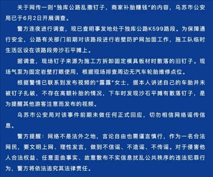 ·新疆烏蘇警方通報(bào)“獨(dú)庫(kù)公路亂撒釘子”:系施工方拆卸板材時(shí)散落,現(xiàn)場(chǎng)排查周邊無(wú)汽車(chē)輪胎維修點(diǎn)。