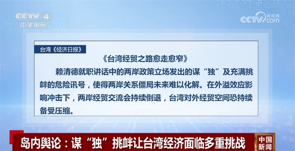 臺(tái)灣《經(jīng)濟(jì)日?qǐng)?bào)》近日發(fā)表題為《臺(tái)灣經(jīng)貿(mào)之路愈走愈窄》的社論指出,賴清德就職講話中的兩岸政策立場(chǎng)發(fā)出的謀“獨(dú)”及充滿挑釁的危險(xiǎn)訊號(hào),使得兩岸關(guān)系僵局未來(lái)難以化解。在外溢效應(yīng)影響沖擊下,兩岸經(jīng)貿(mào)交流會(huì)持續(xù)倒退,臺(tái)灣對(duì)外經(jīng)貿(mào)空間恐持續(xù)備受壓縮。