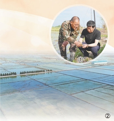 圖①:于海河(右)在田間地頭和村民一起查看水稻長(zhǎng)勢(shì)。 本報(bào)記者 方 圓攝圖②:完成了機(jī)械化插秧的水稻田。虎林市委宣傳部供圖