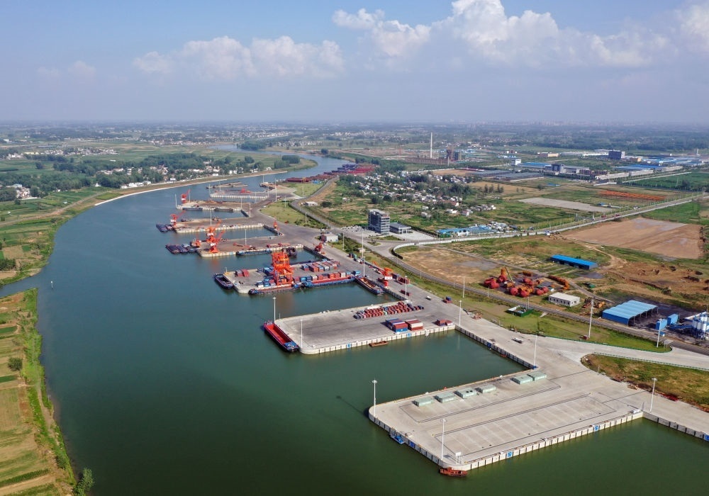 2022年6月28日拍攝的河南周口中心港碼頭(無人機照片)。近年來,河南積極推進(jìn)沙潁河航道升級改造,疏通內(nèi)河航運?,F(xiàn)在,從周口中心港出發(fā)的船舶可經(jīng)沙潁河至淮河、京杭大運河駛?cè)腴L江,讓內(nèi)陸城市亦能通江達(dá)海。