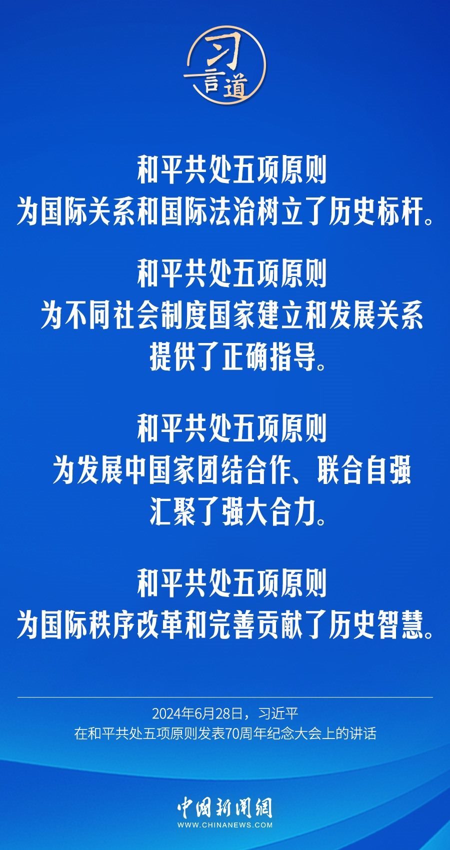 6月28日,國家主席習近平在北京人民大會堂出席和平共處五項原則發(fā)表70周年紀念大會并發(fā)表重要講話。習近平指出——