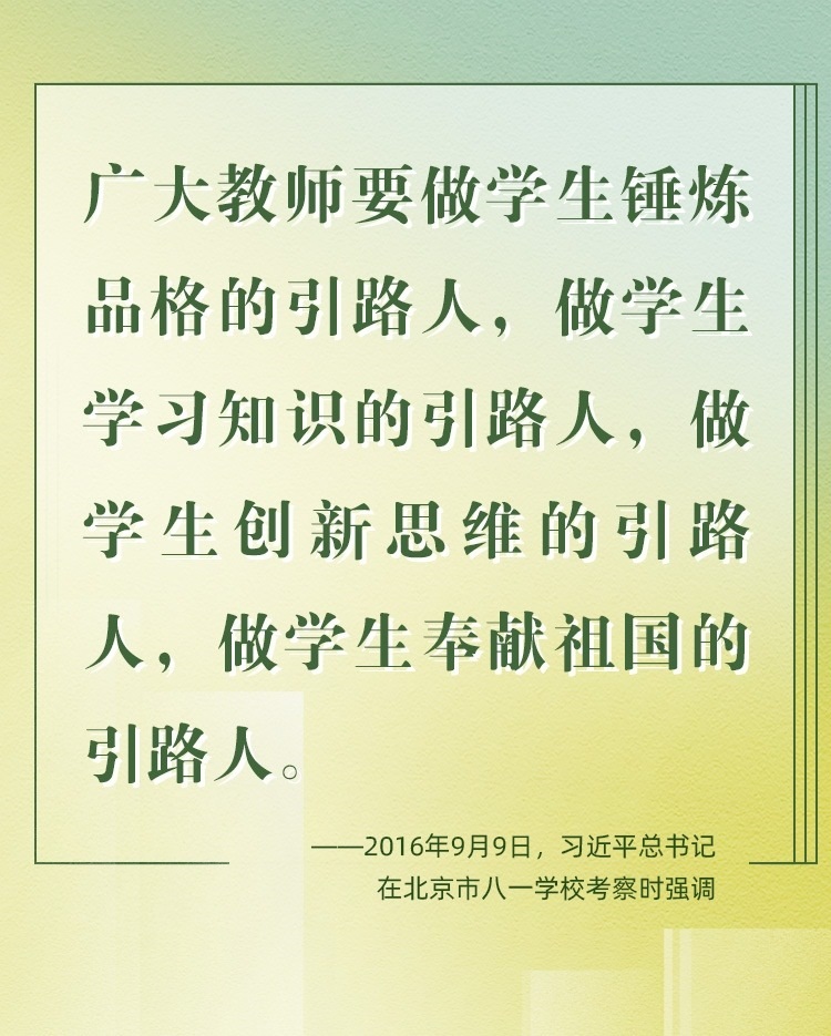 他們帶領(lǐng)學(xué)生前行,更新舊知、開(kāi)掘新知、探索未知;他們肩負(fù)光榮使命,為黨育人、為國(guó)育才、為民育未來(lái)。守教育報(bào)國(guó)初心、擔(dān)立德樹(shù)人使命、圓民族復(fù)興之夢(mèng),建設(shè)社會(huì)主義現(xiàn)代化強(qiáng)國(guó)之路上,教育家精神自當(dāng)念茲在茲、代代傳承、光芒永綻。