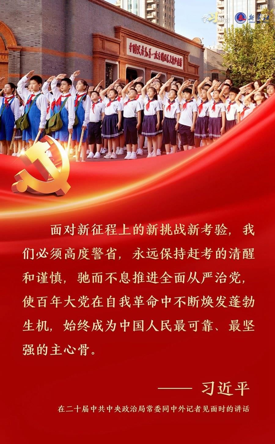習(xí)近平總書記強(qiáng)調(diào),面對新征程上的新挑戰(zhàn)新考驗(yàn),我們必須高度警省,永遠(yuǎn)保持趕考的清醒和謹(jǐn)慎,馳而不息推進(jìn)全面從嚴(yán)治黨,使百年大黨在自我革命中不斷煥發(fā)蓬勃生機(jī),始終成為中國人民最可靠、最堅(jiān)強(qiáng)的主心骨。