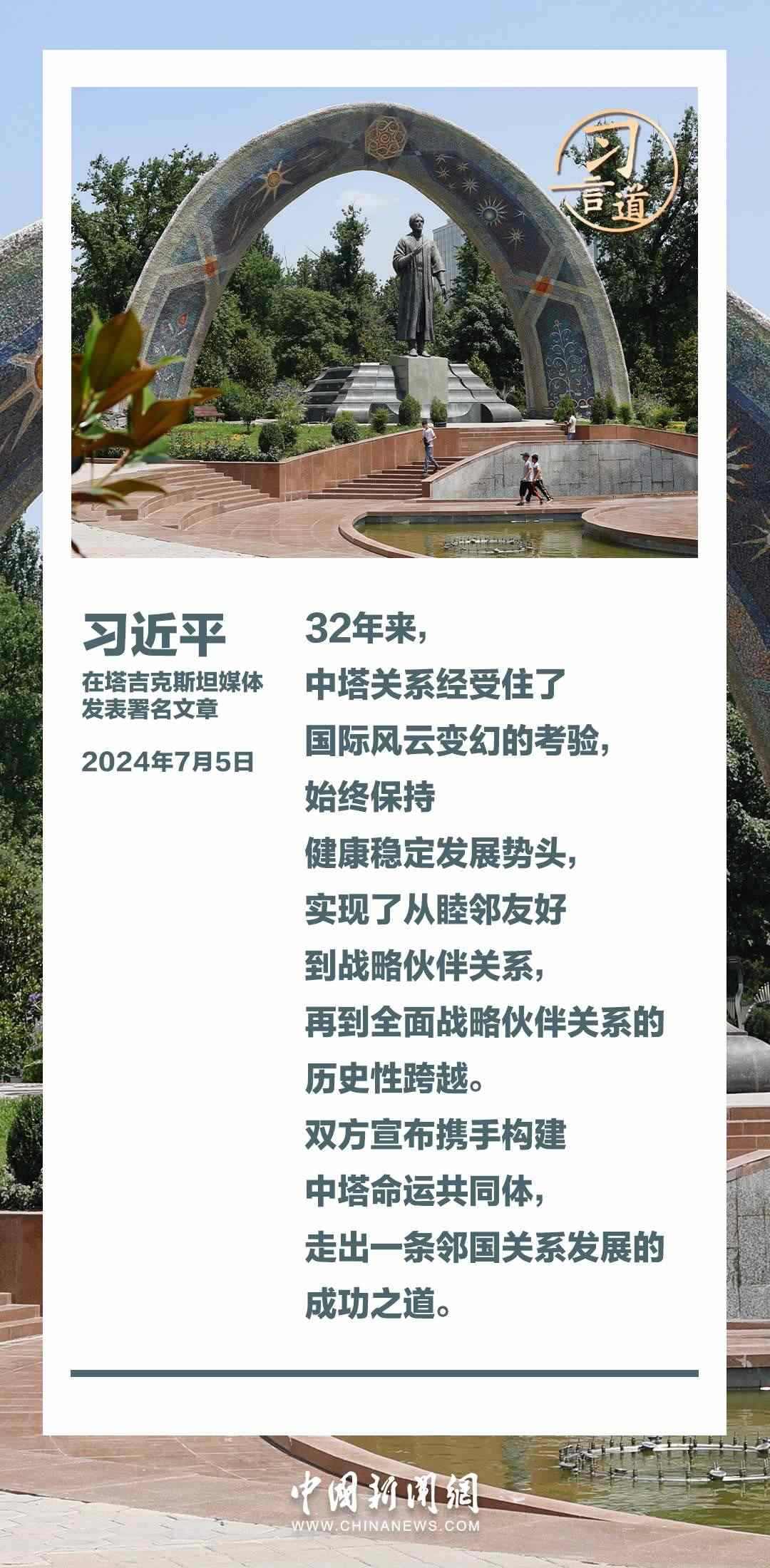 7月5日,在對塔吉克斯坦進行國事訪問之際,國家主席習近平在塔吉克斯坦《人民報》和“霍瓦爾”國家通訊社發(fā)表題為《共創(chuàng)中塔關系美好明天》的署名文章。習近平指出——