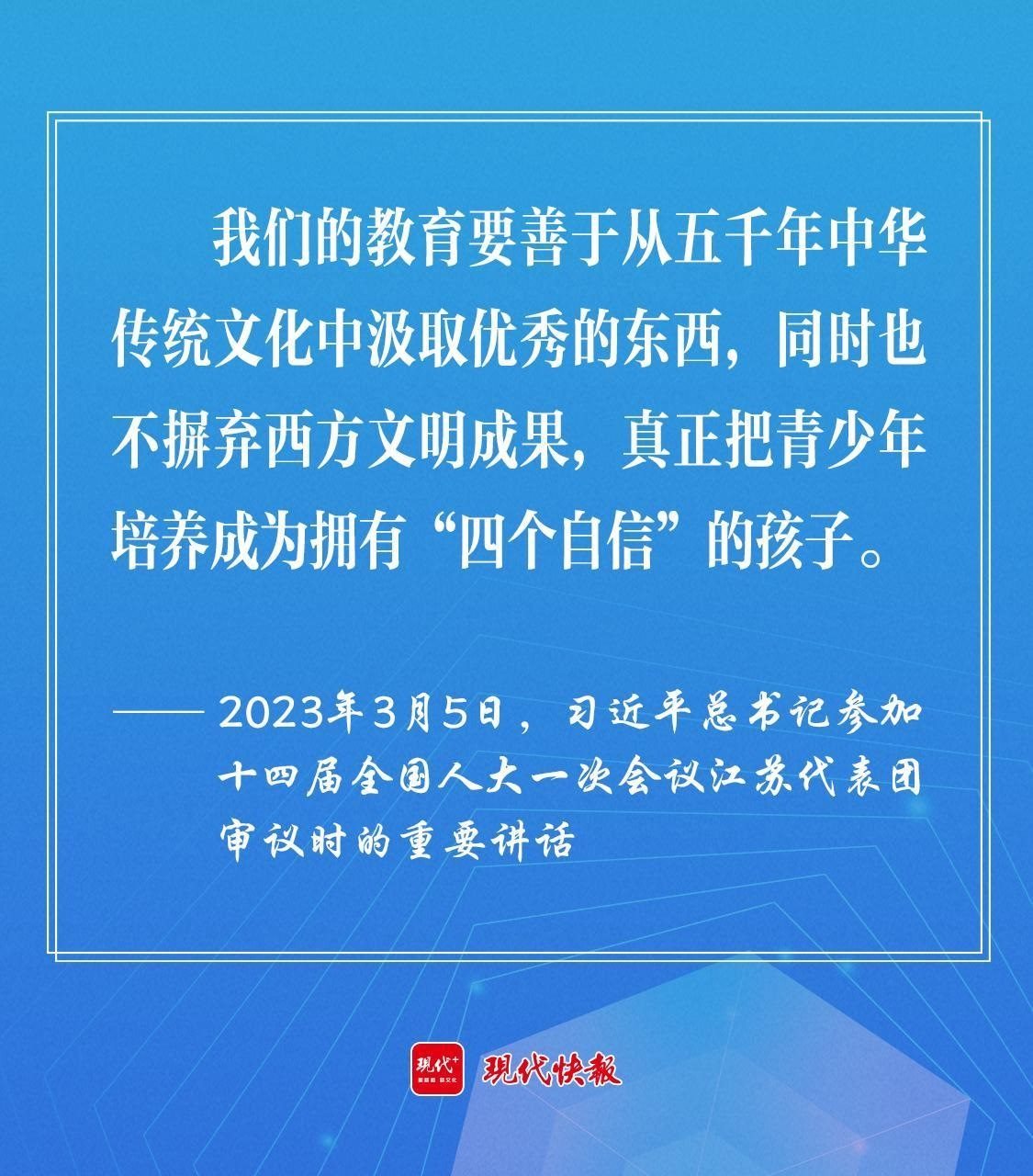 2023年3月5日,習(xí)近平總書記參加十四屆全國人大一次會議江蘇代表團審議時,勉勵教育工作者“要善于從五千年中華傳統(tǒng)文化中汲取優(yōu)秀的東西,同時也不摒棄西方文明成果,真正把青少年培養(yǎng)成為擁有‘四個自信’的孩子?!?/p>