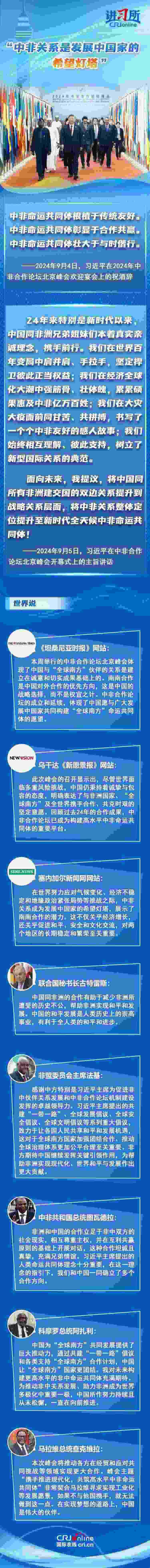 從宣布建立“新型伙伴關(guān)系”,到整體定位提升至“新時(shí)代全天候中非命運(yùn)共同體”,成立24年的中非合作論壇不斷推動(dòng)中非關(guān)系實(shí)現(xiàn)跨越式發(fā)展,特別是新時(shí)代以來(lái),中國(guó)本著真實(shí)親誠(chéng)理念,同非洲兄弟姐妹們攜手前行,受到非方廣泛稱(chēng)贊。非方各界認(rèn)為,為推動(dòng)非中關(guān)系發(fā)展、助力非洲成為世界多極化中重要一極,中國(guó)所作努力持續(xù)且從未松懈,中非關(guān)系是發(fā)展中國(guó)家的希望燈塔。