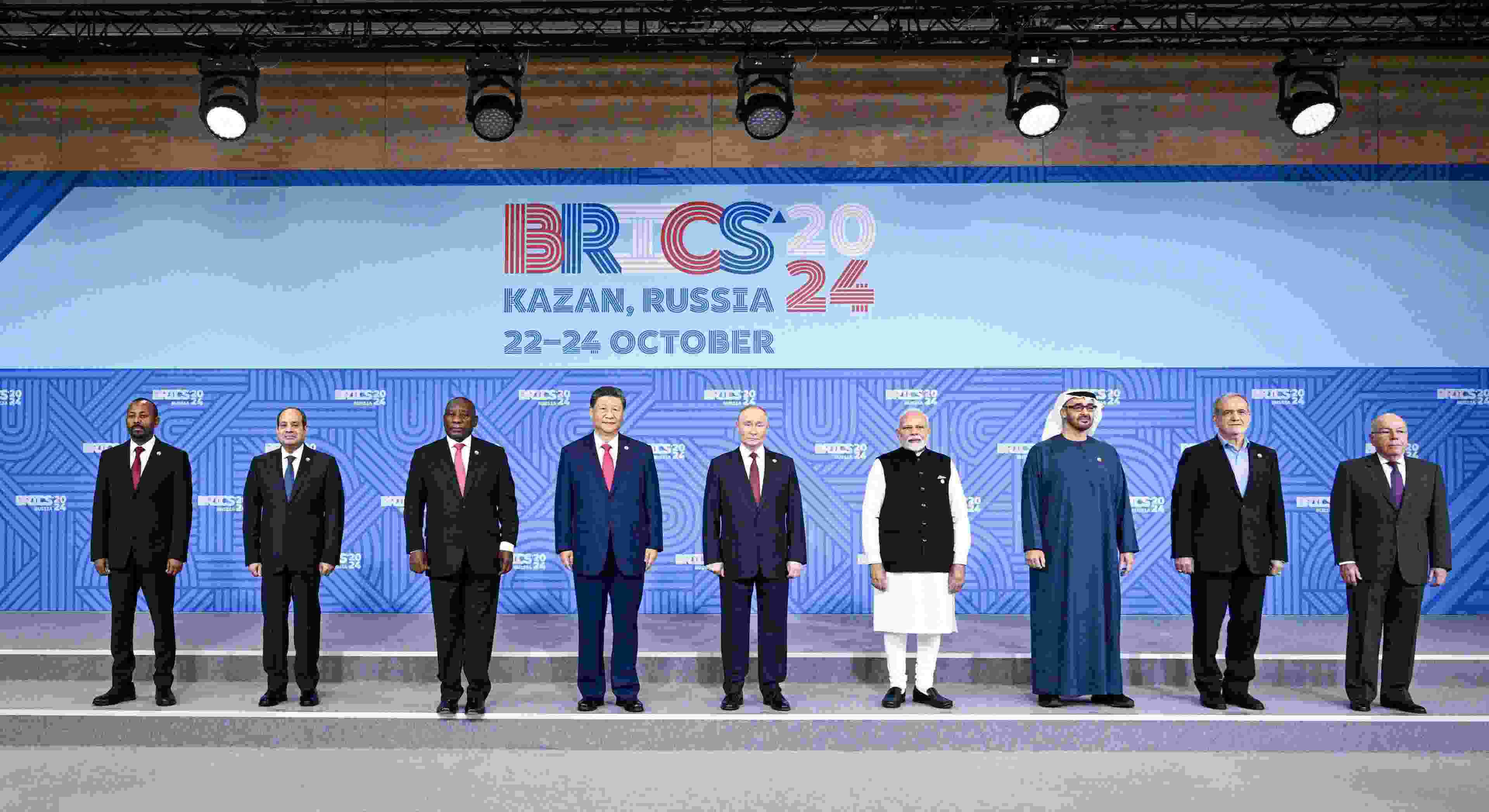 △當地時間2024年10月24日上午,國家主席習近平在喀山會展中心出席金磚成員國、嘉賓國領導人和國際組織負責人集體合影。