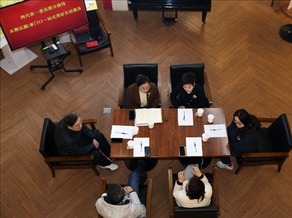 2023年2月17日,上海市長(zhǎng)寧區(qū)虹橋街道古北市民中心主任盛弘和居民代表討論社區(qū)服務(wù)功能的相關(guān)議題。新華社記者 劉穎 攝