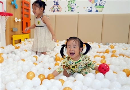 上海市靜安區(qū)江寧路街道社區(qū)黨群服務(wù)中心內(nèi)的“寶寶屋”,小朋友們?cè)谕嫠#?022年9月27日攝)。新華社記者 劉穎 攝