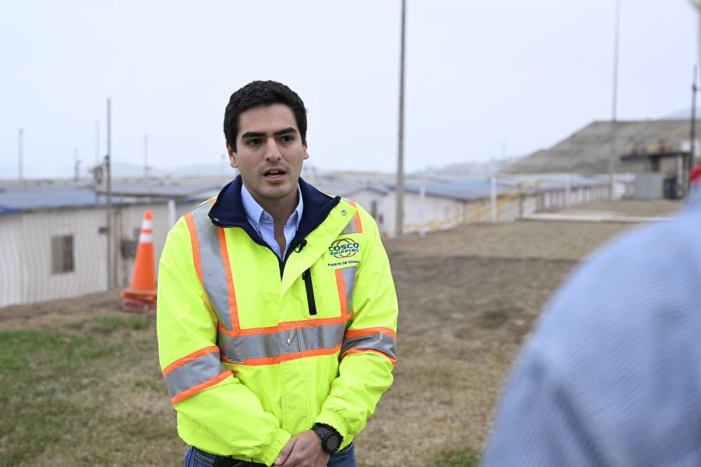2024年6月21日,秘魯青年丹尼爾·哈雷斯在錢凱港項目現(xiàn)場接受媒體采訪。項目啟動之初,丹尼爾·哈雷斯還是一名剛?cè)肼殘龅膶嵙暽?,如?7歲的他已成長為項目工程部合同管理員。隨著錢凱港建設不斷推進,項目的工作崗位在當?shù)爻蔀槟贻p人就業(yè)的熱門選項。
