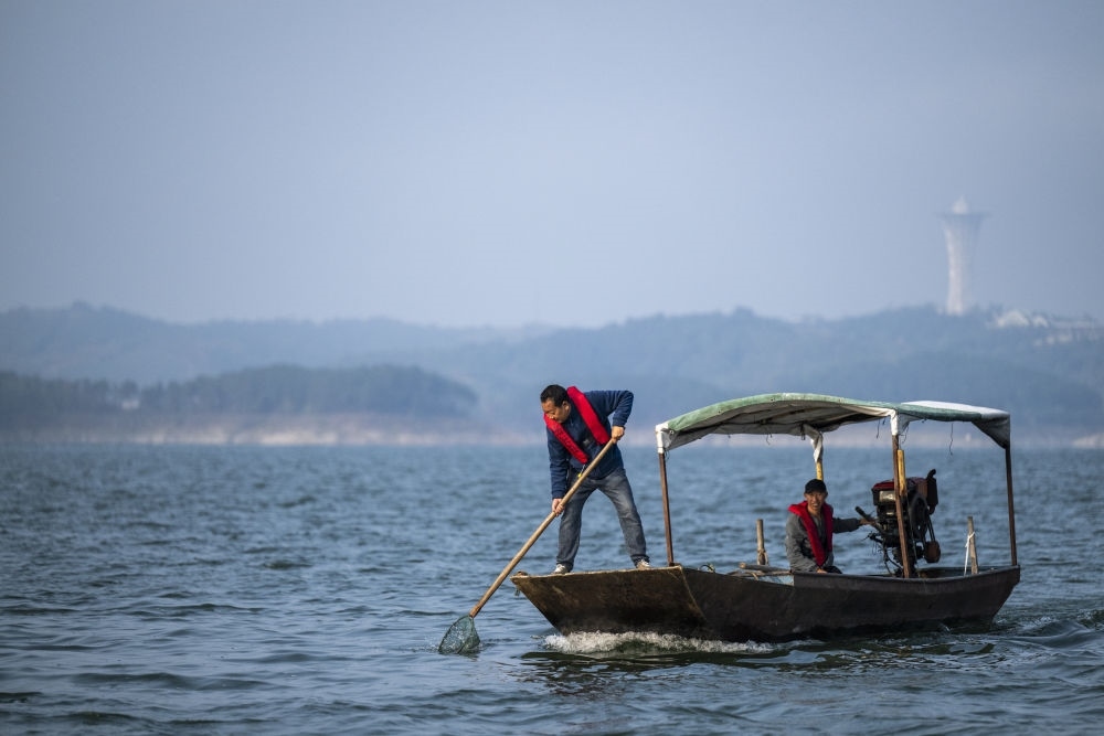 2024年10月28日,丹江口市清漂隊隊員在庫區(qū)進行清漂作業(yè)。
