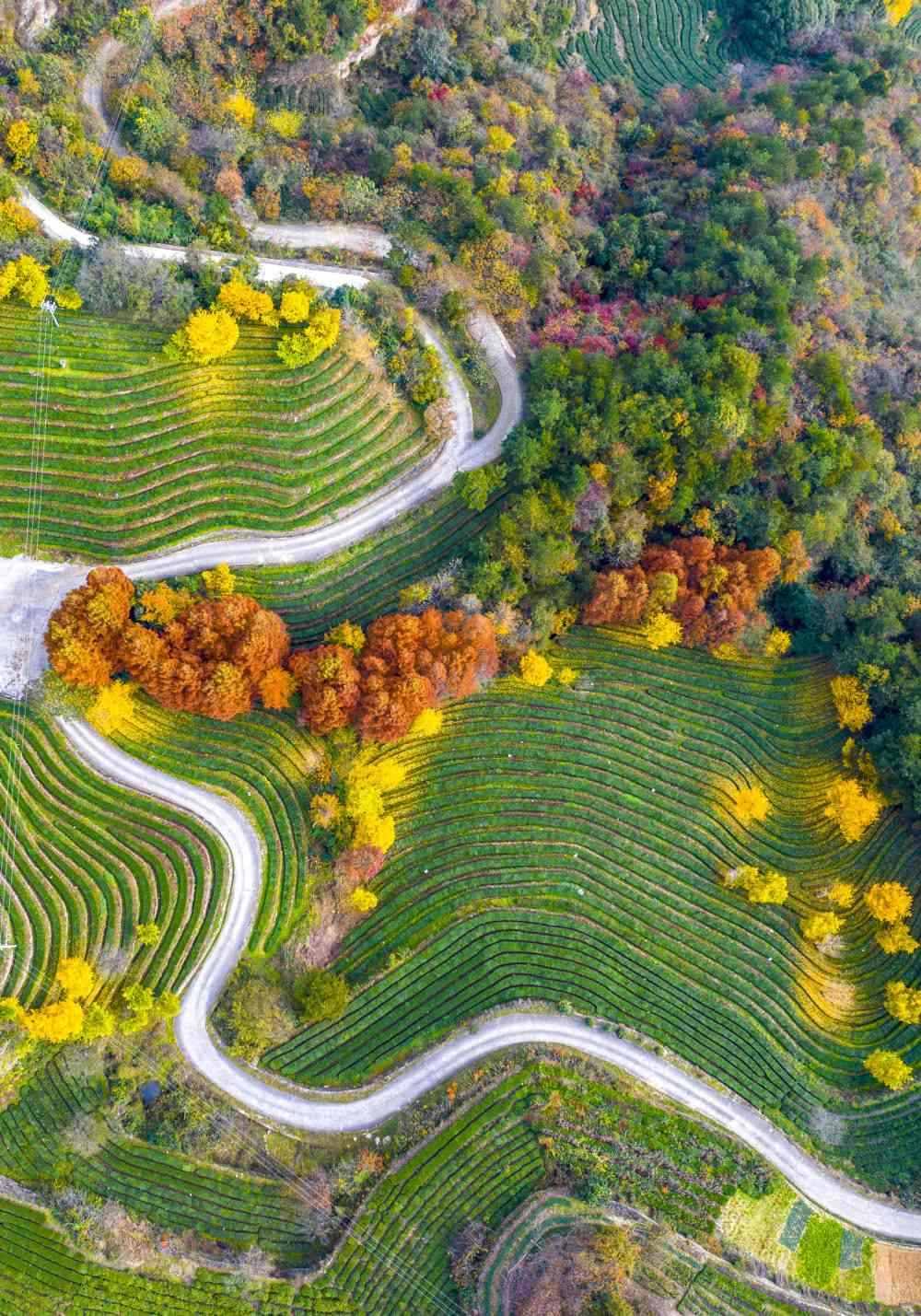 2023年11月24日在十堰市武當山旅游經濟特區(qū)八仙觀村拍攝的茶園(無人機照片)。