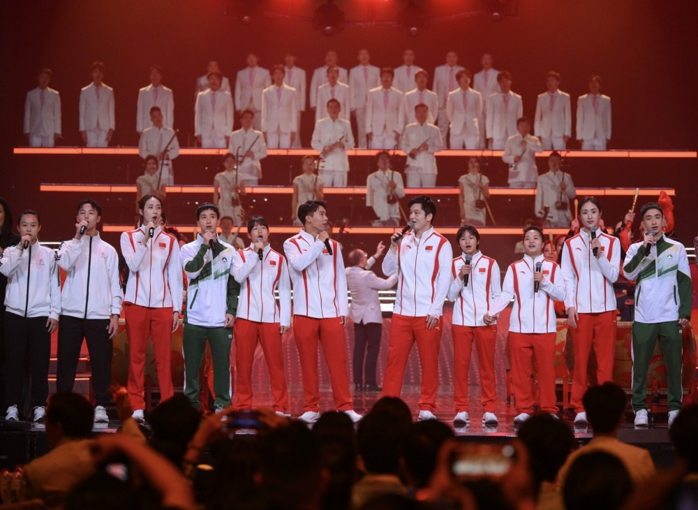 2024年9月22日,在2024“灣區(qū)升明月”大灣區(qū)電影音樂晚會上,澳門體育運(yùn)動員代表與參加巴黎奧運(yùn)會的內(nèi)地健兒一起演唱歌曲。