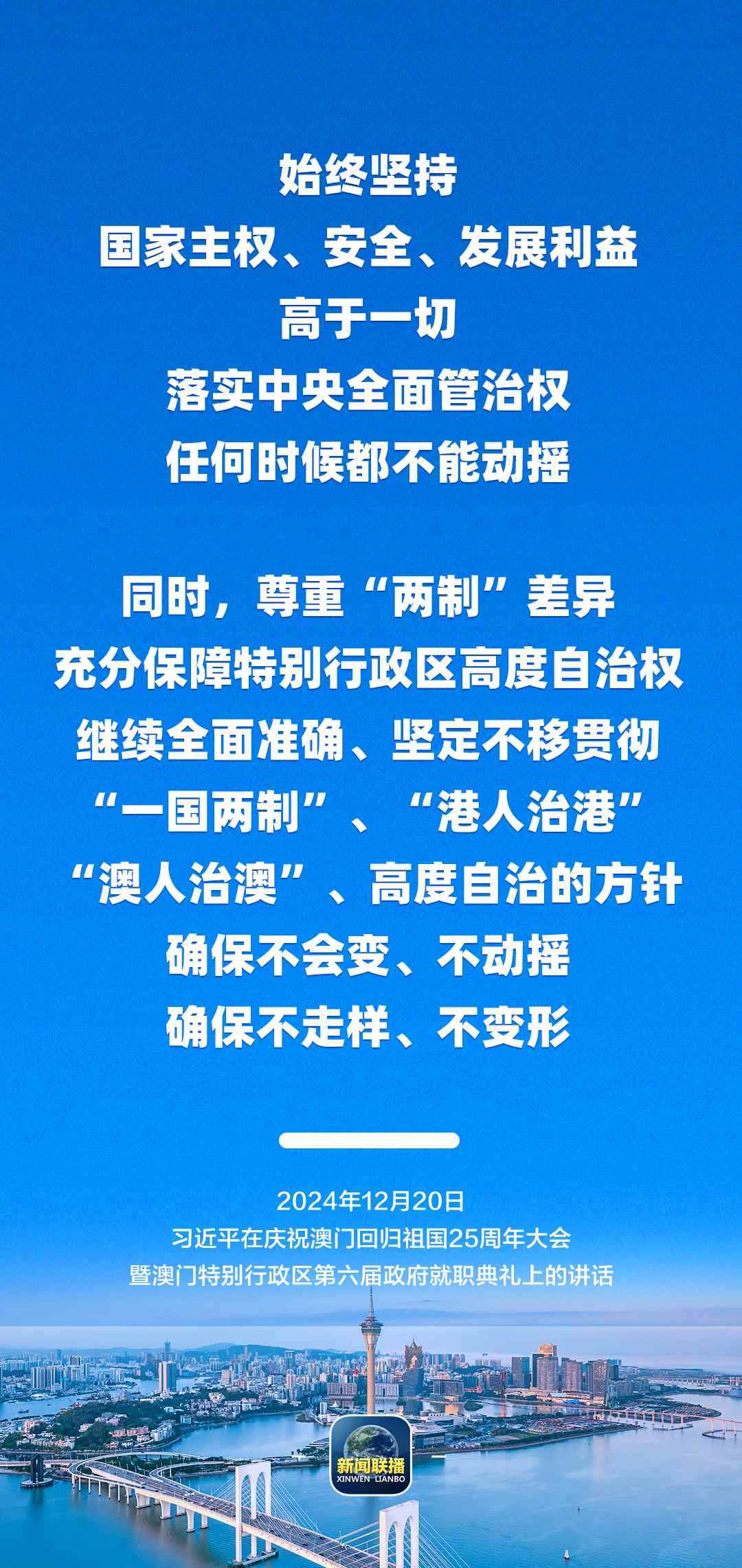 習(xí)近平強調(diào),只要全面準確、堅定不移貫徹“一國兩制”方針,有特別行政區(qū)政府和社會各界共同努力,有偉大祖國作堅強后盾,澳門一定能打開發(fā)展新天地、不斷創(chuàng)造新輝煌,一定能為以中國式現(xiàn)代化全面推進強國建設(shè)、民族復(fù)興偉業(yè)作出更大貢獻。