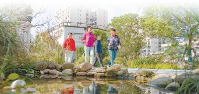 市民在長寧區(qū)北新涇街道新涇五村花園散步。
